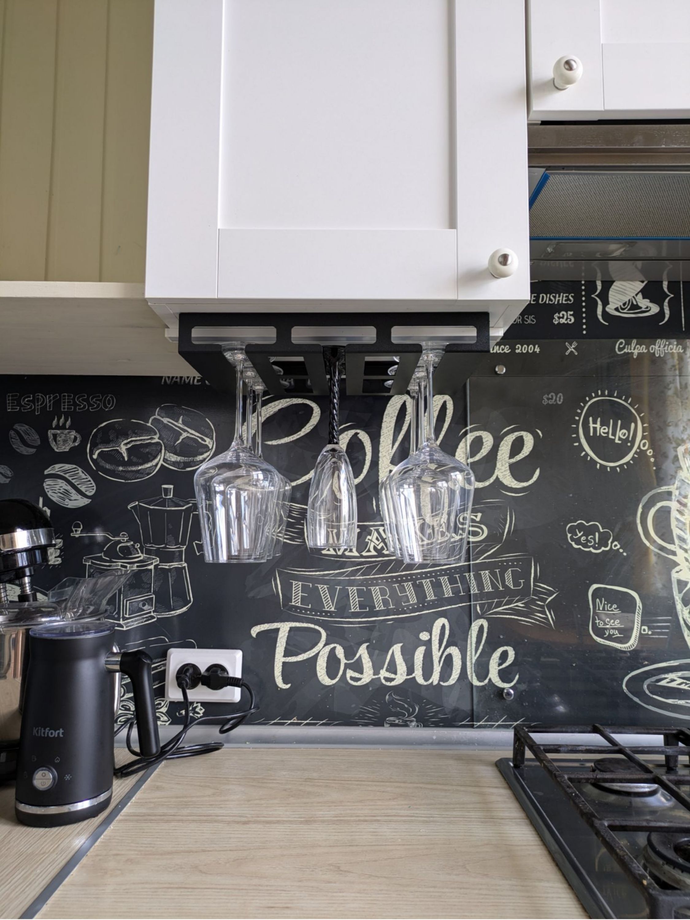 Данный бокалодержатель имеет 3 секции, что позволяет разместить сразу несколько бокалов различных видов, будь то фужеры, винные бокалы или рюмки на ножке. Держатель для бокалов легко устанавливается и подходит для использования в любом уголке кухни, создавая аккуратное и организованное пространство.