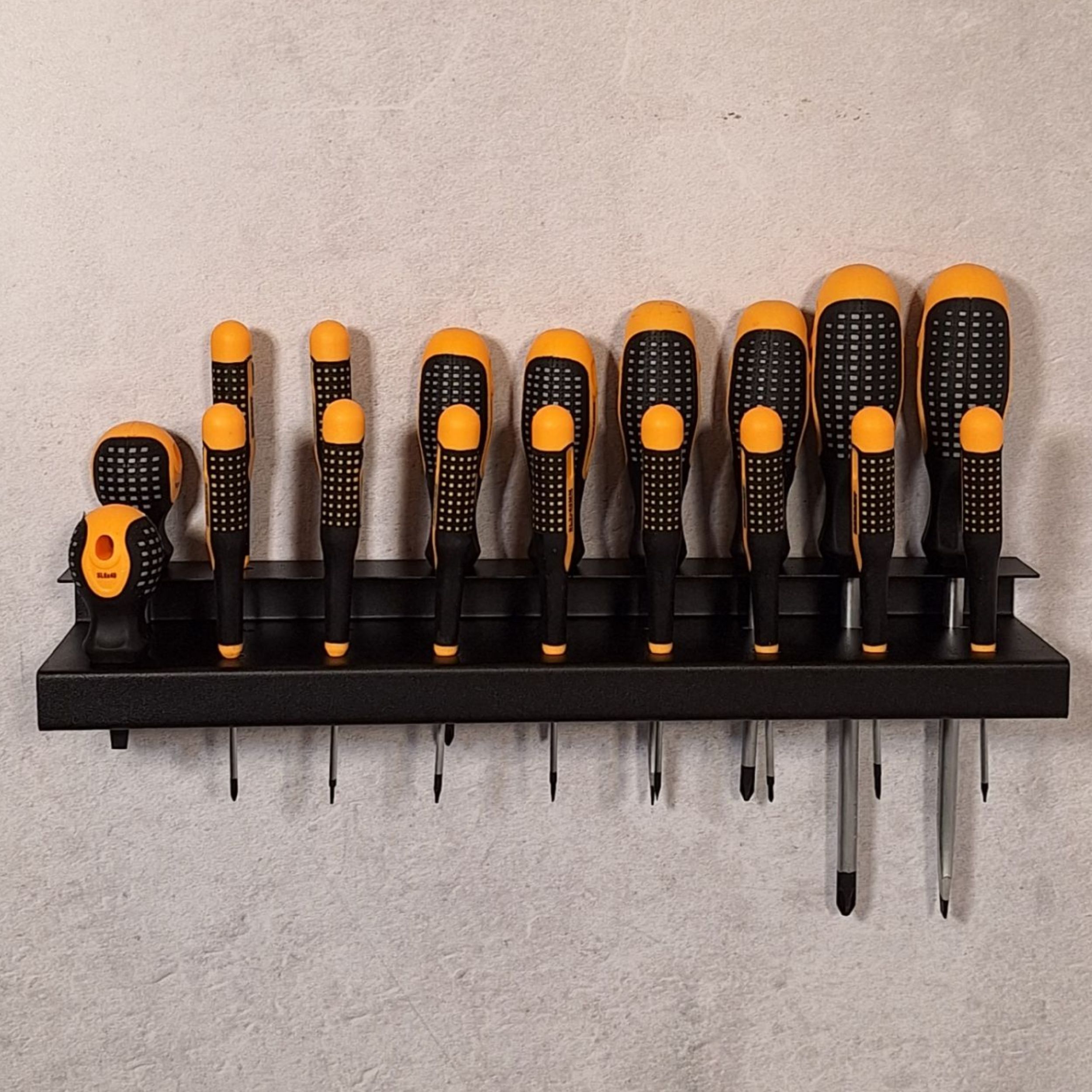 Органайзер для инструментов имеет продуманную конструкцию, предусматривающую место для хранения 14 отверток следующих видов: SL (прямой), PH (крестообразный), PZ (крестообразный с засечками), HX (шестигранник) и TORX, а также Шило и Надфили.Система хранения инструментов оснащена необходимым для монтажа комплектом крепежа.