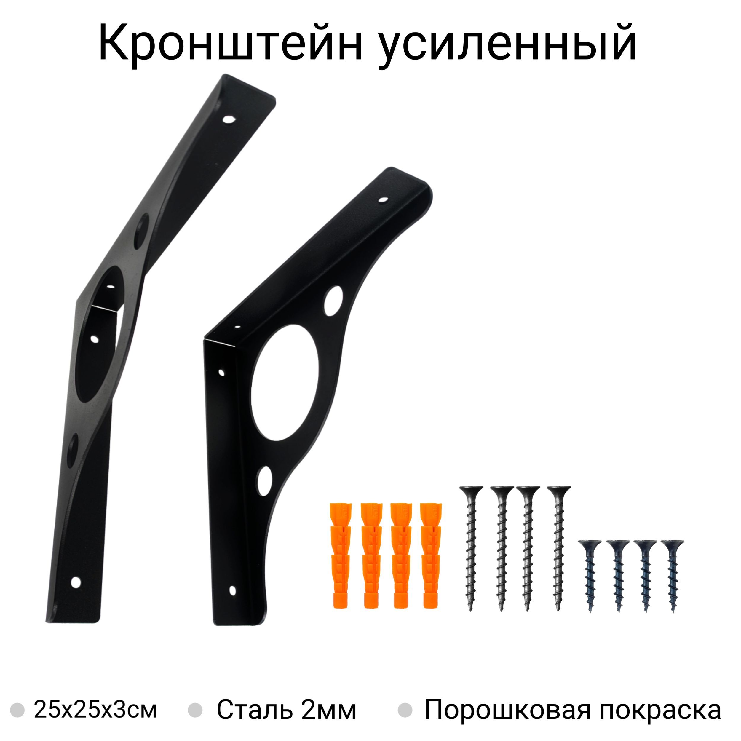 Кронштейн для полки металлический усиленный, в комплекте 2 штуки, габариты: 250*250 мм, цвет черный матовый. Кронштейн предназначен для установки полок и стеллажей настенного крепления. Усиленный кронштейн применяется там, где требуется опора, выдерживающая большие нагрузки.