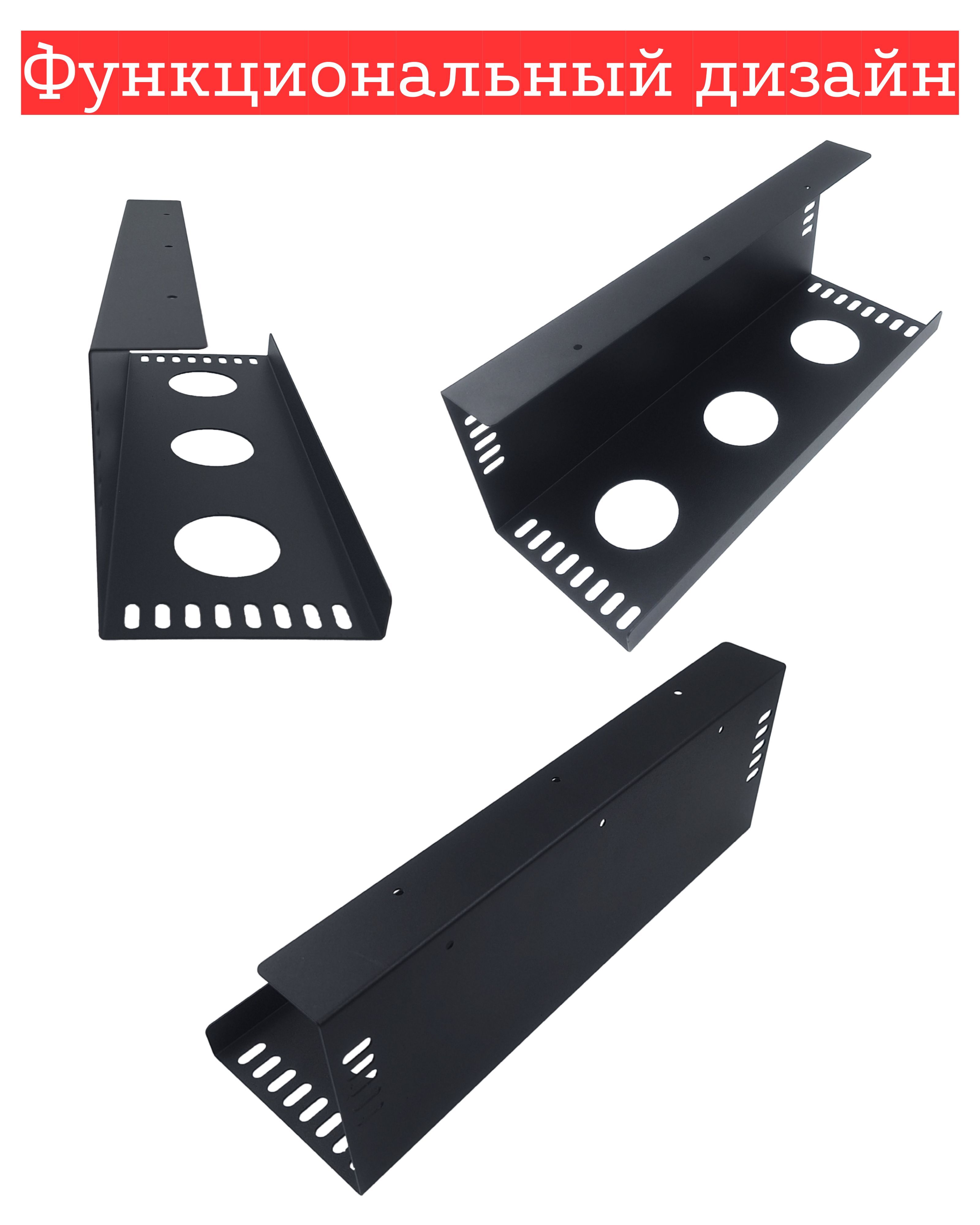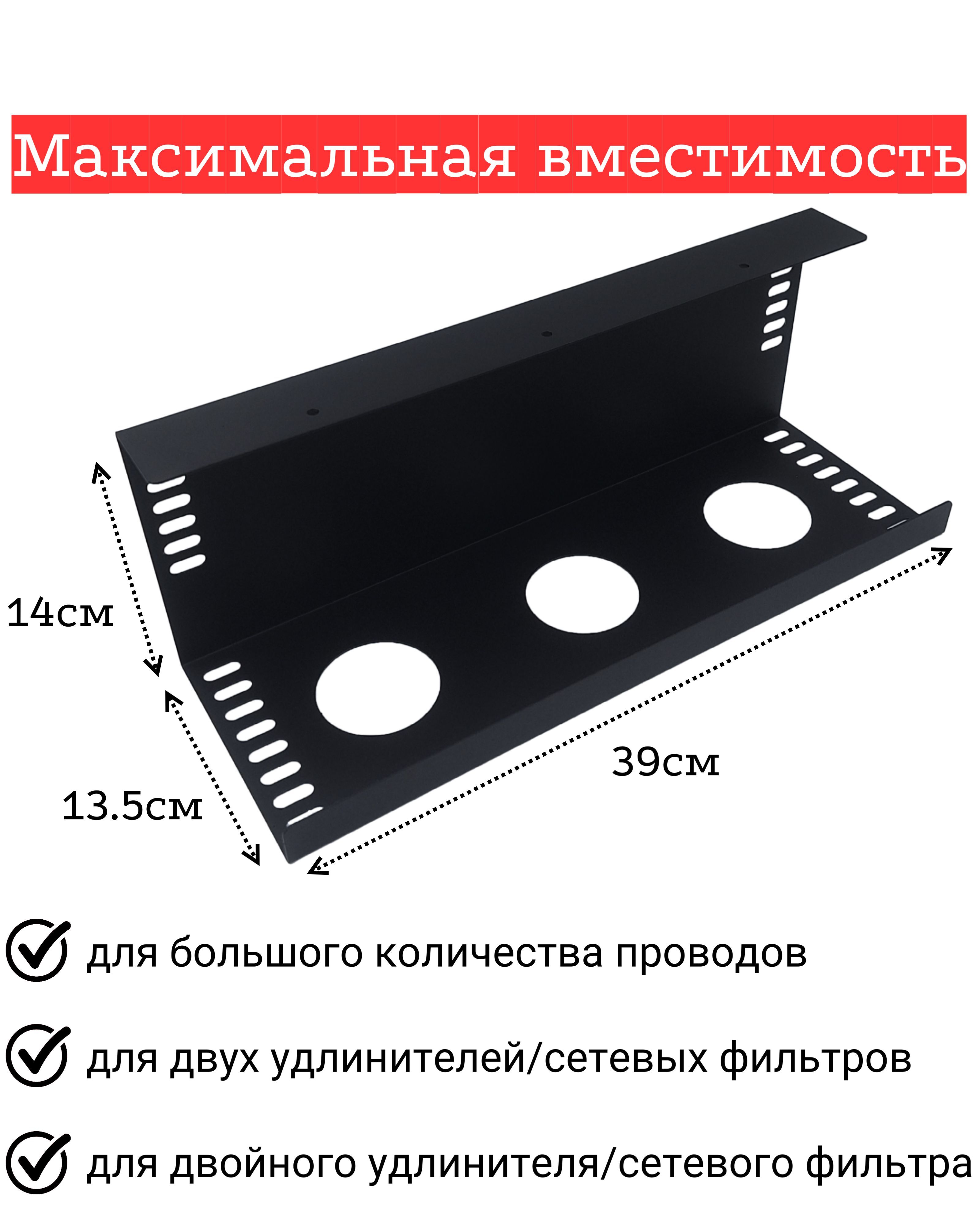 Органайзер для проводов и зарядок для двух сетевых фильтров подойдет как для дома, так и для офиса. Держатель для проводов широкий легко крепится под столом с помощью 3-х саморезов, которые идут в комплекте, а шляпки саморезов скроют декоративные заглушки. Подвесной держатель для сетевого фильтра или удлинителя большой отлично защищает провода от перегиба, они перестанут болтаться под столом. Подвесной бокс для проводов большой изготовлен из качественного метала, покрыт порошковой краской, а значит прослужит Вам долгие годы. Короб для проводов также отлично подойдет для складирования мелких предметов. Кабель канал на два удлинителя поможет организовать качественный кабель-менеджмент, освободить пространство под столом, поместить провода в недоступное для детей и животных месте. Держатель для удлинителя для двойного удлинителя на стену имеет отверстия, позволяющие закрепить его к столешнице, задней стенке стола или стене. Подвесной органайзер для двойного сетевого фильтра отличается отличным качеством, изготовлен из толстого металла и покрыт высококачественной порошковой краской. Аксессуары для компьютерного стола, такие как наш органайзер для проводов под стол это незаменимая вещь для организации пространства Вашего рабочего места.