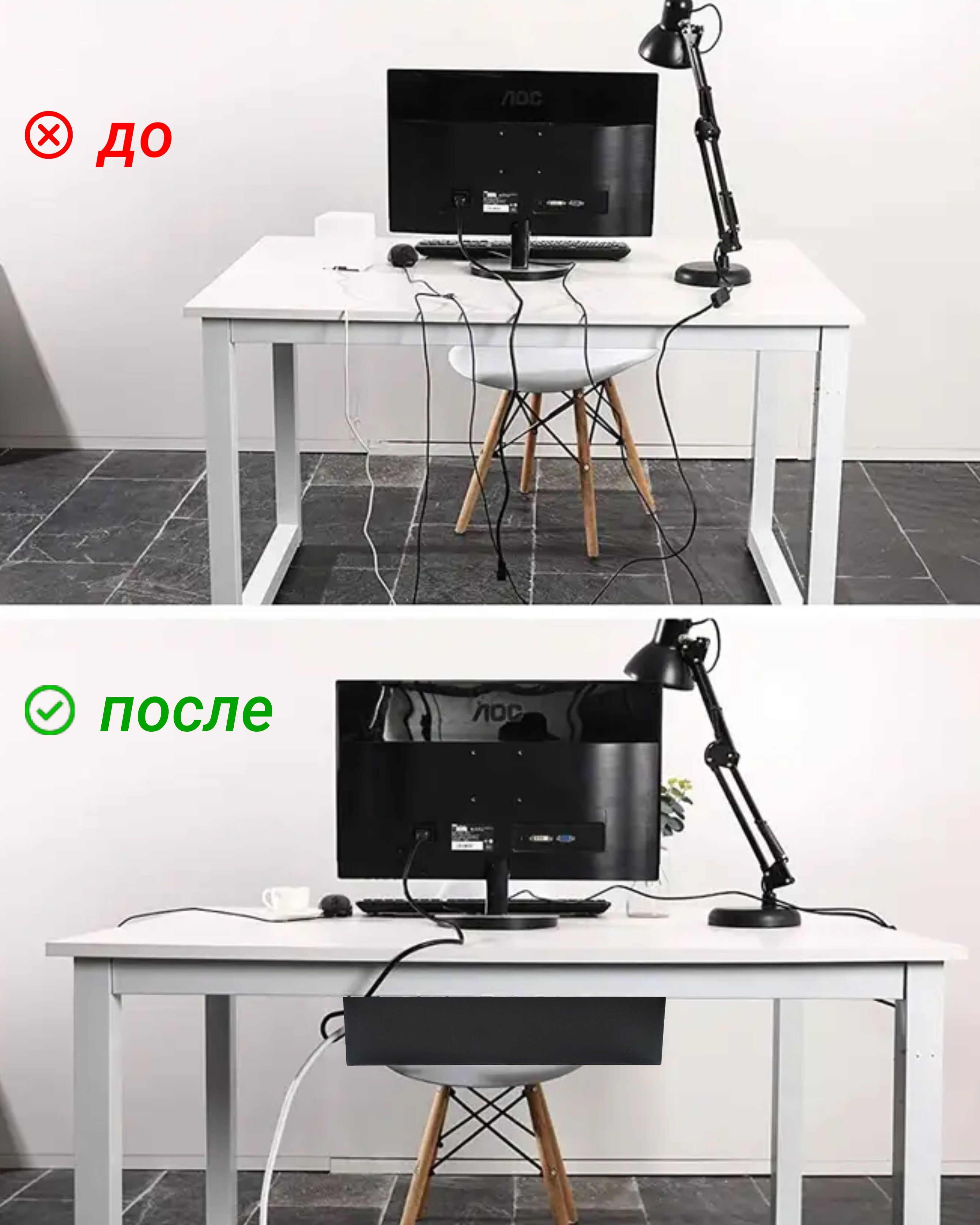 Органайзер для проводов и зарядок для сетевых фильтров подойдет как для дома, так и для офиса. Держатель для проводов легко крепится под столом с помощью 2-х саморезов, которые идут в комплекте, а шляпки саморезов скроют декоративные заглушки. Подвесной держатель для сетевого фильтра или удлинителя отлично защищает провода от перегиба, они перестанут болтаться под столом.