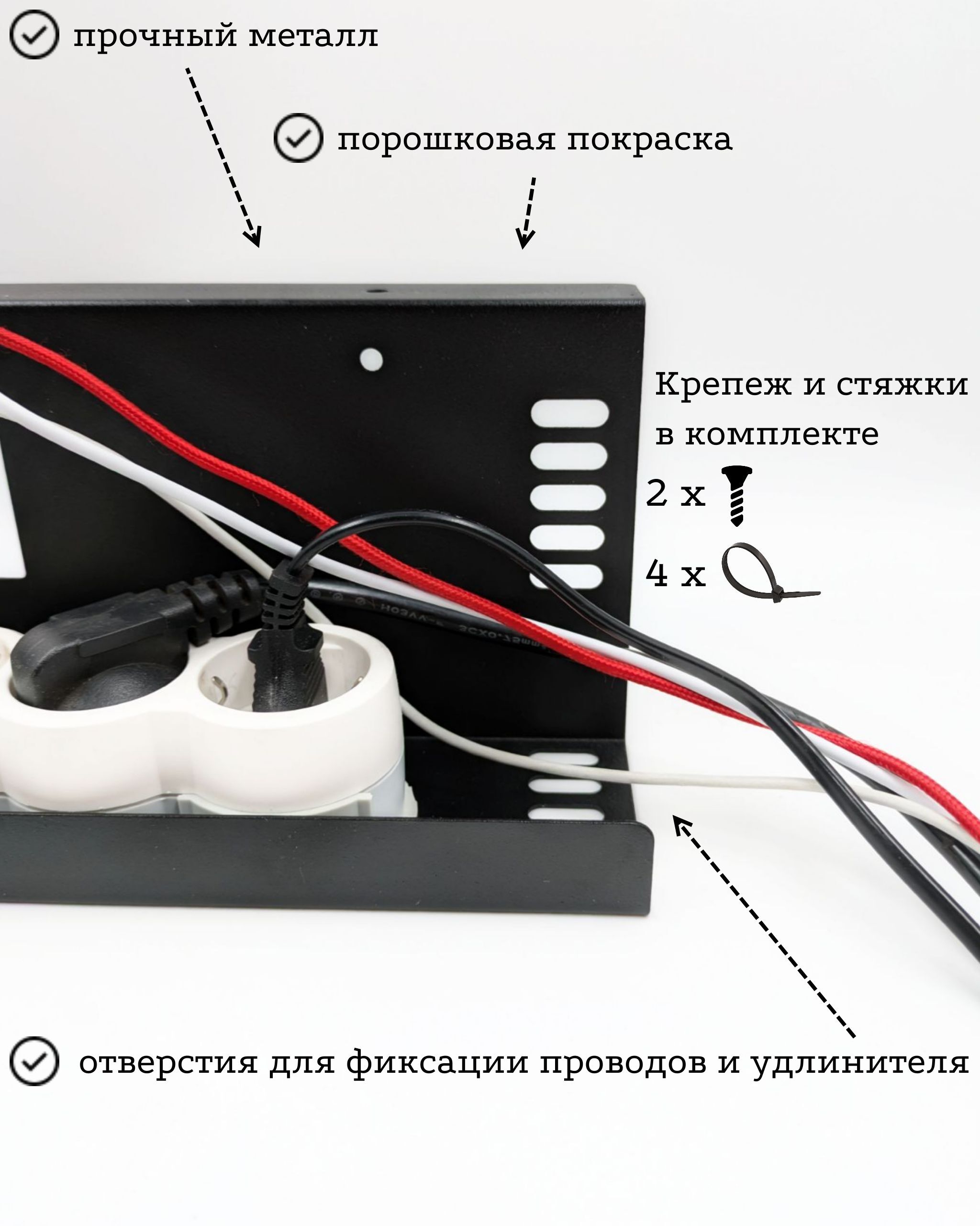 Органайзер для проводов и зарядок подойдет как для дома, так и для офиса. Держатель для удлинителя легко крепится под столом с помощью 2-х саморезов, которые идут в комплекте, а шляпки саморезов скроют декоративные заглушки. Подвесной бокс для проводов изготовлен из качественного метала, покрыт порошковой краской, а значит прослужит Вам долгие годы.
