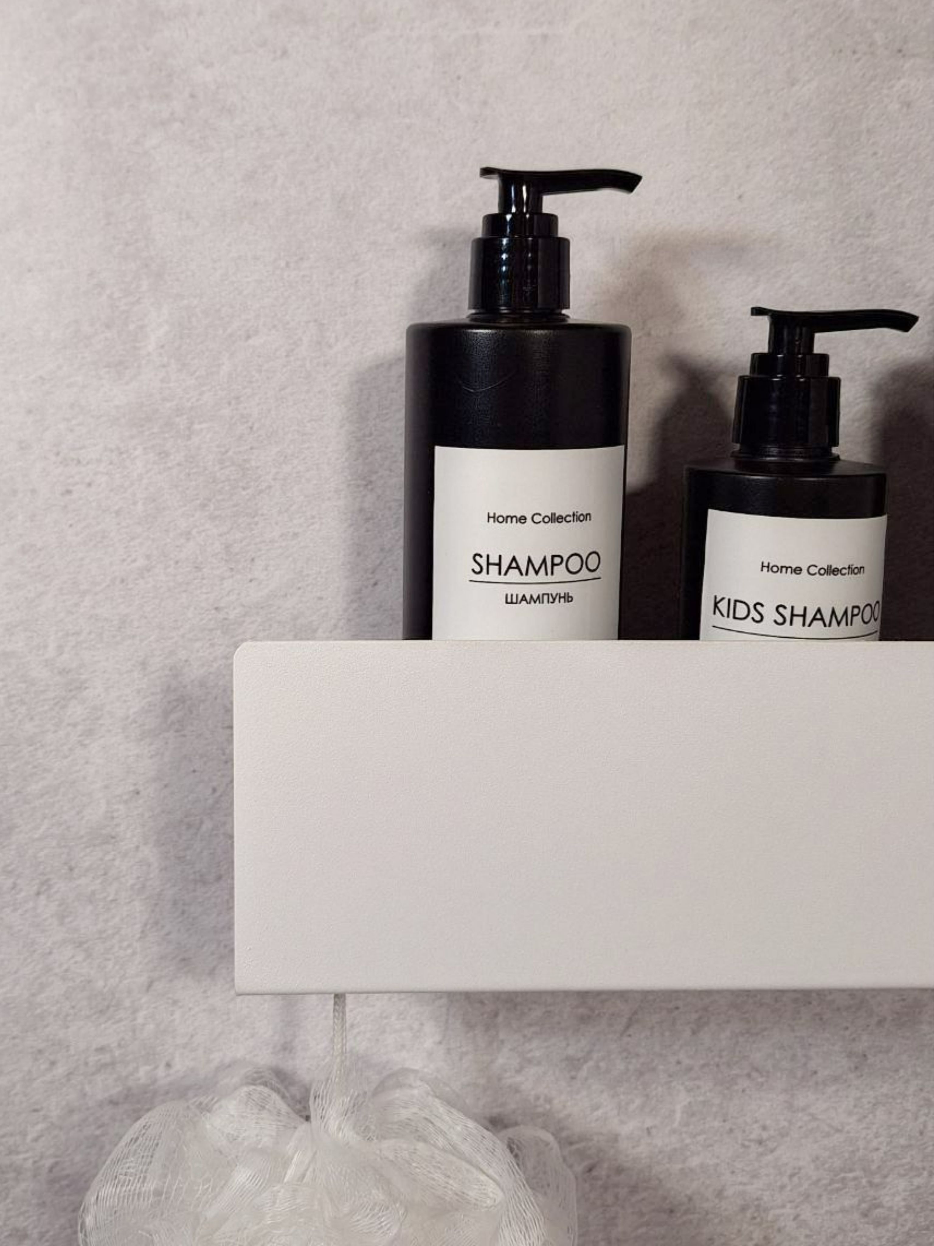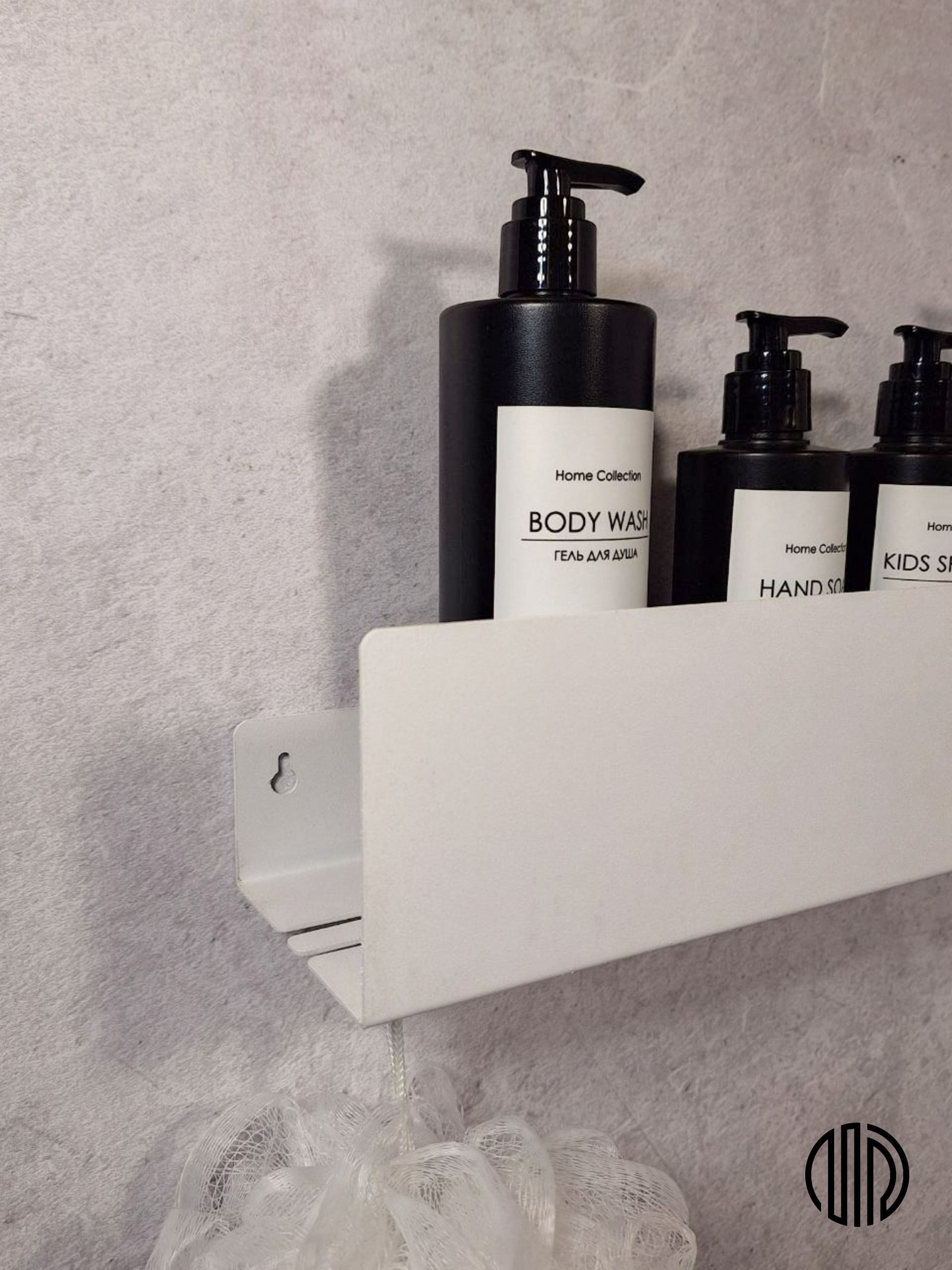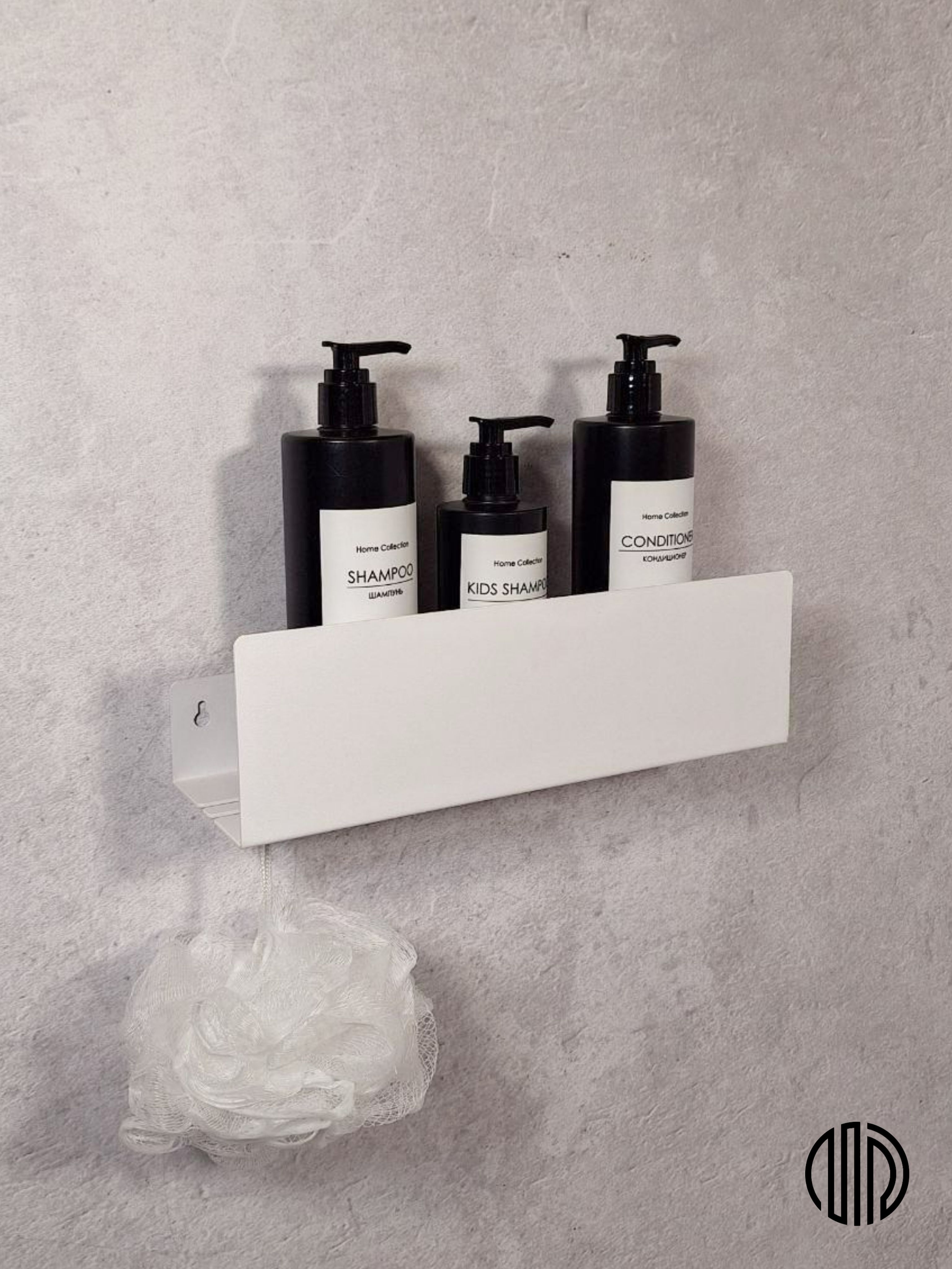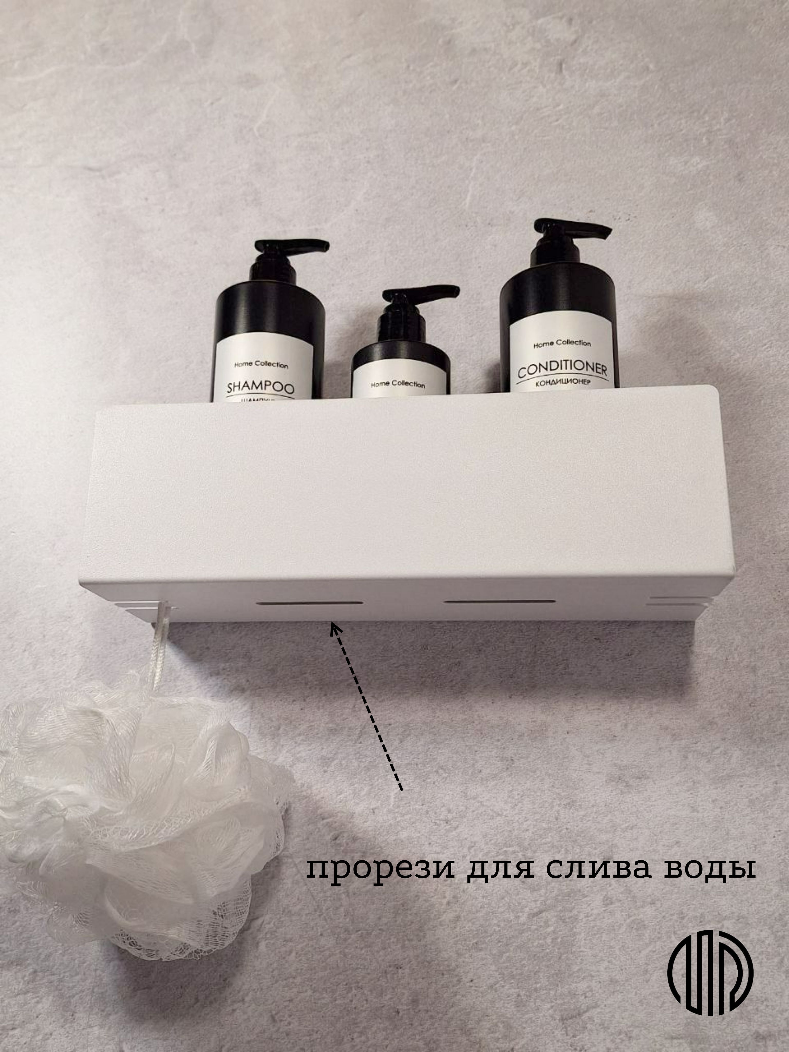 Полка для дома из металла покрыта порошковой краской, данный аксессуар для ванной комнаты стойкий к воде и царапинам. Полка оснащена вырезами для стока воды, а также удобными крючками для мочалки или полотенца . Полочка в ванную комнату придает стильный дизайн интерьеру.