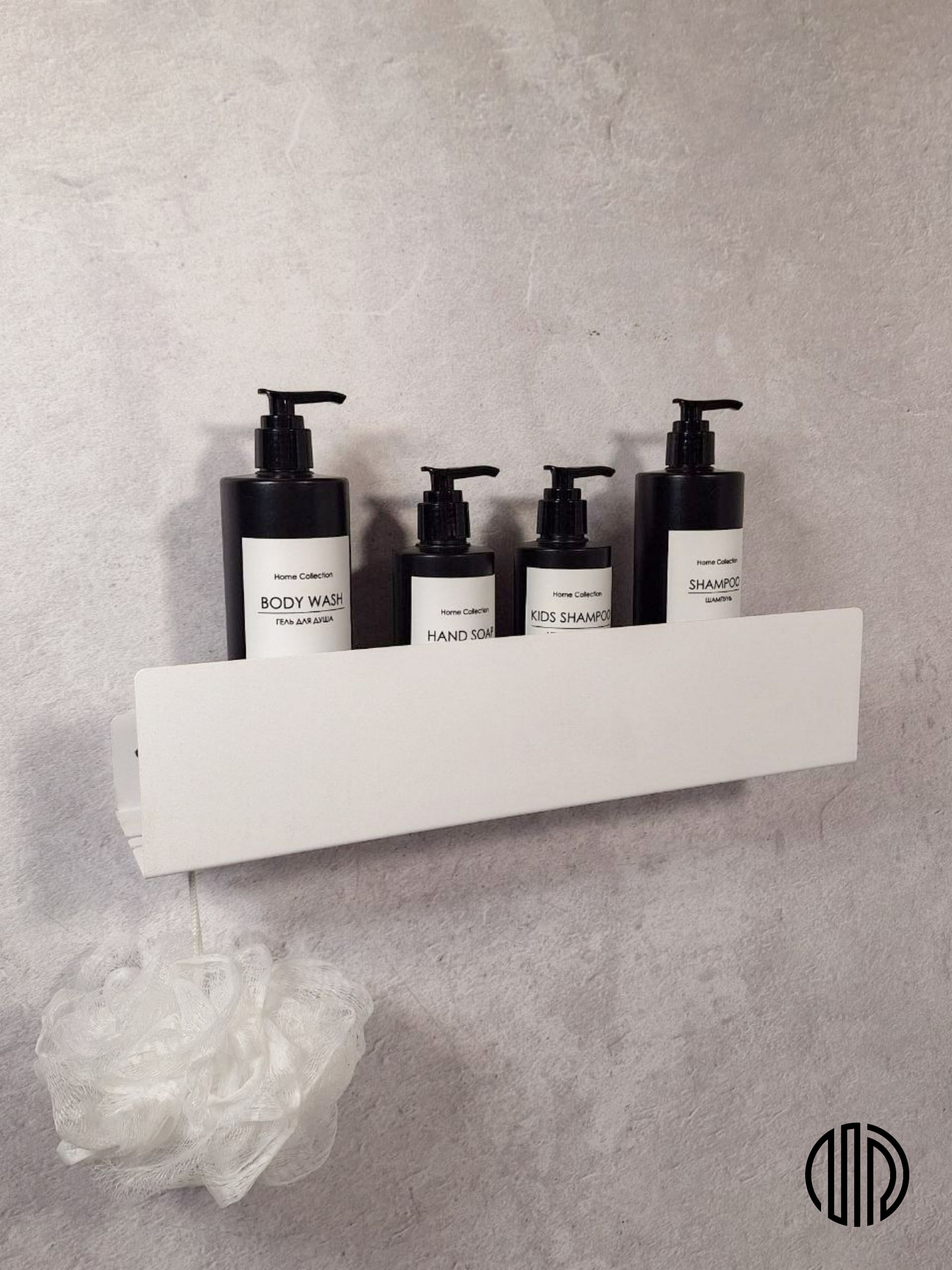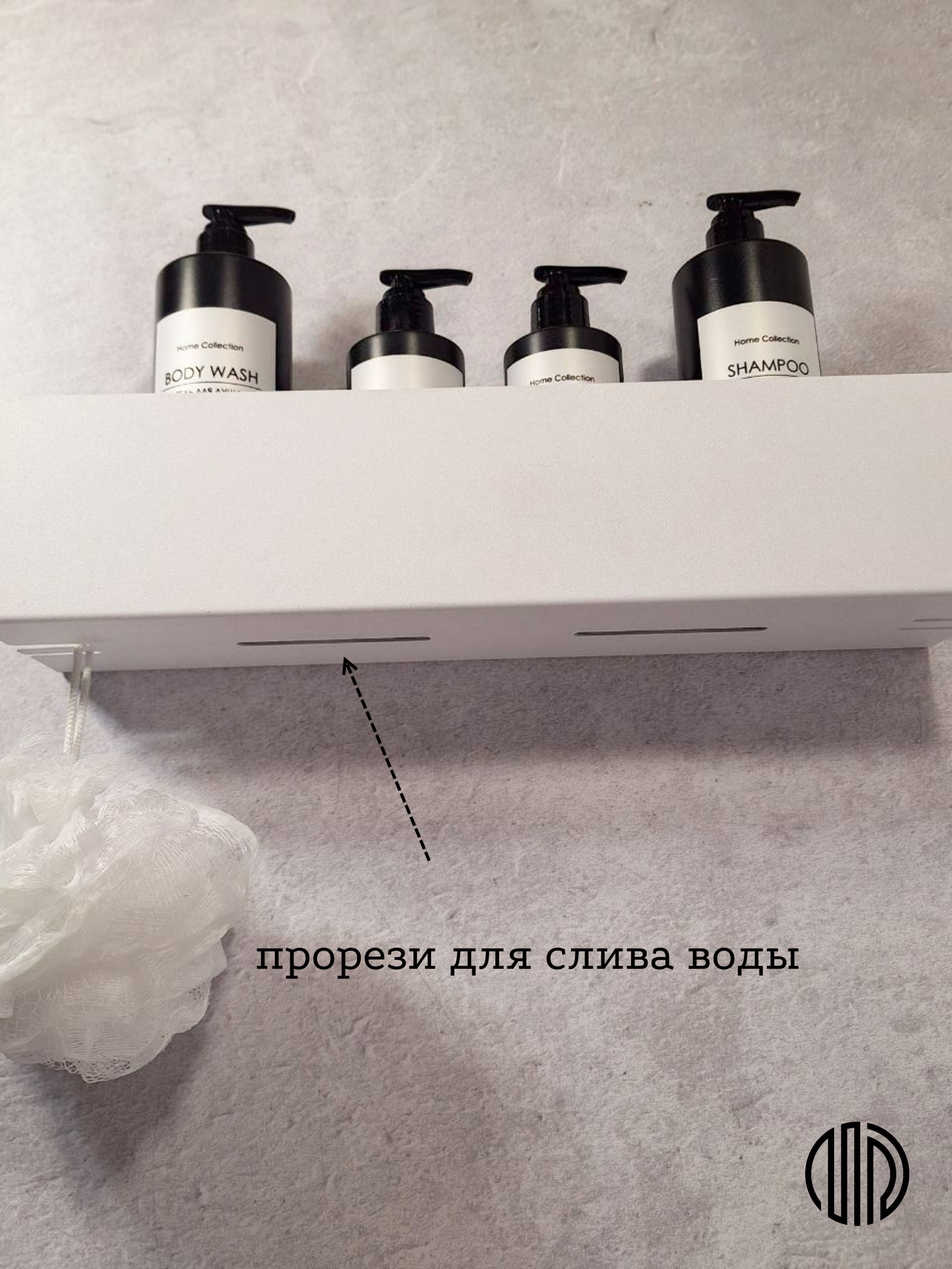 Полка для дома из металла покрыта порошковой краской, данный аксессуар для ванной комнаты стойкий к воде и царапинам. Полка оснащена вырезами для стока воды, а также удобными крючками для мочалки или полотенца . Полочка в ванную комнату придает стильный дизайн интерьеру.