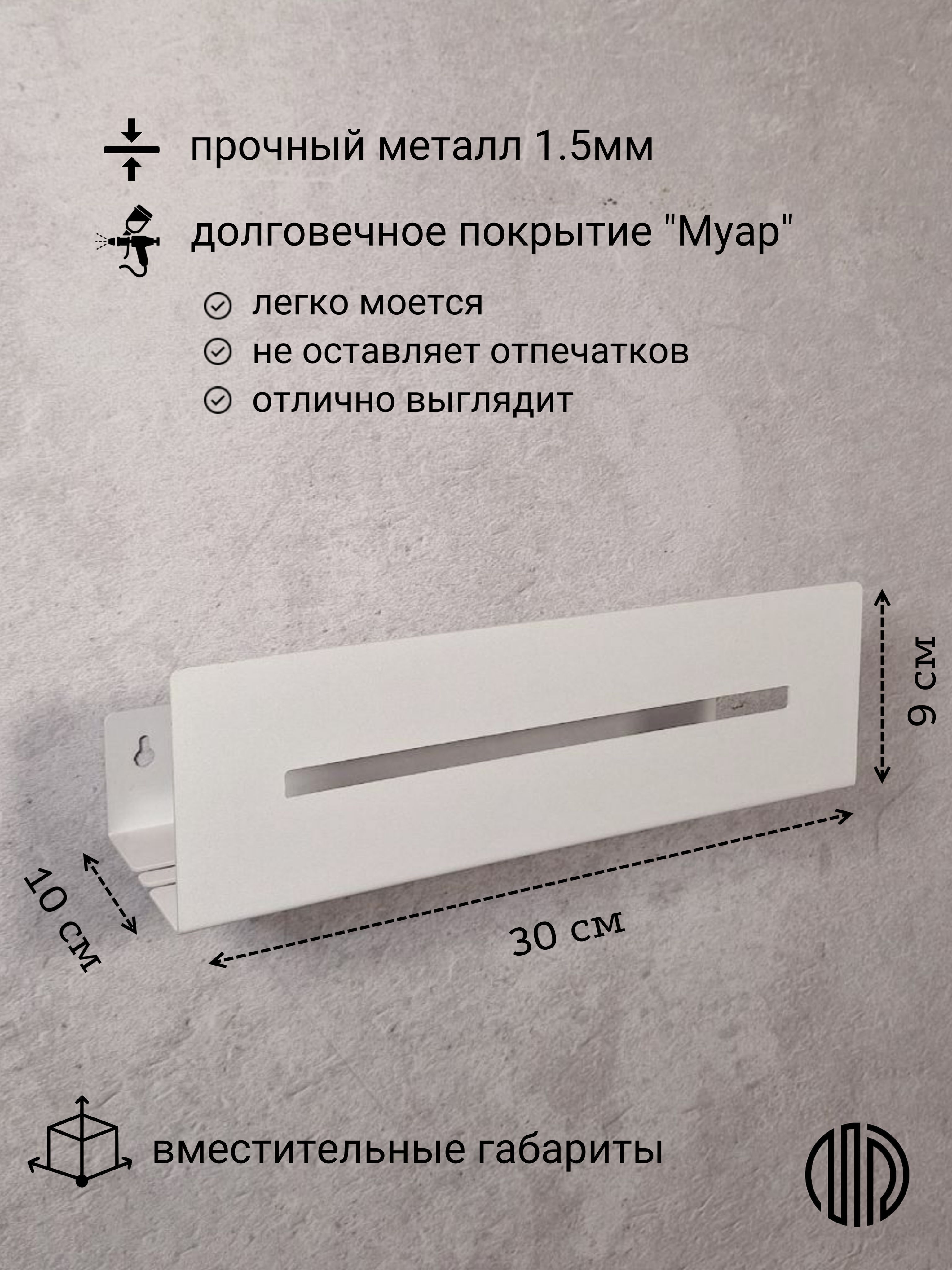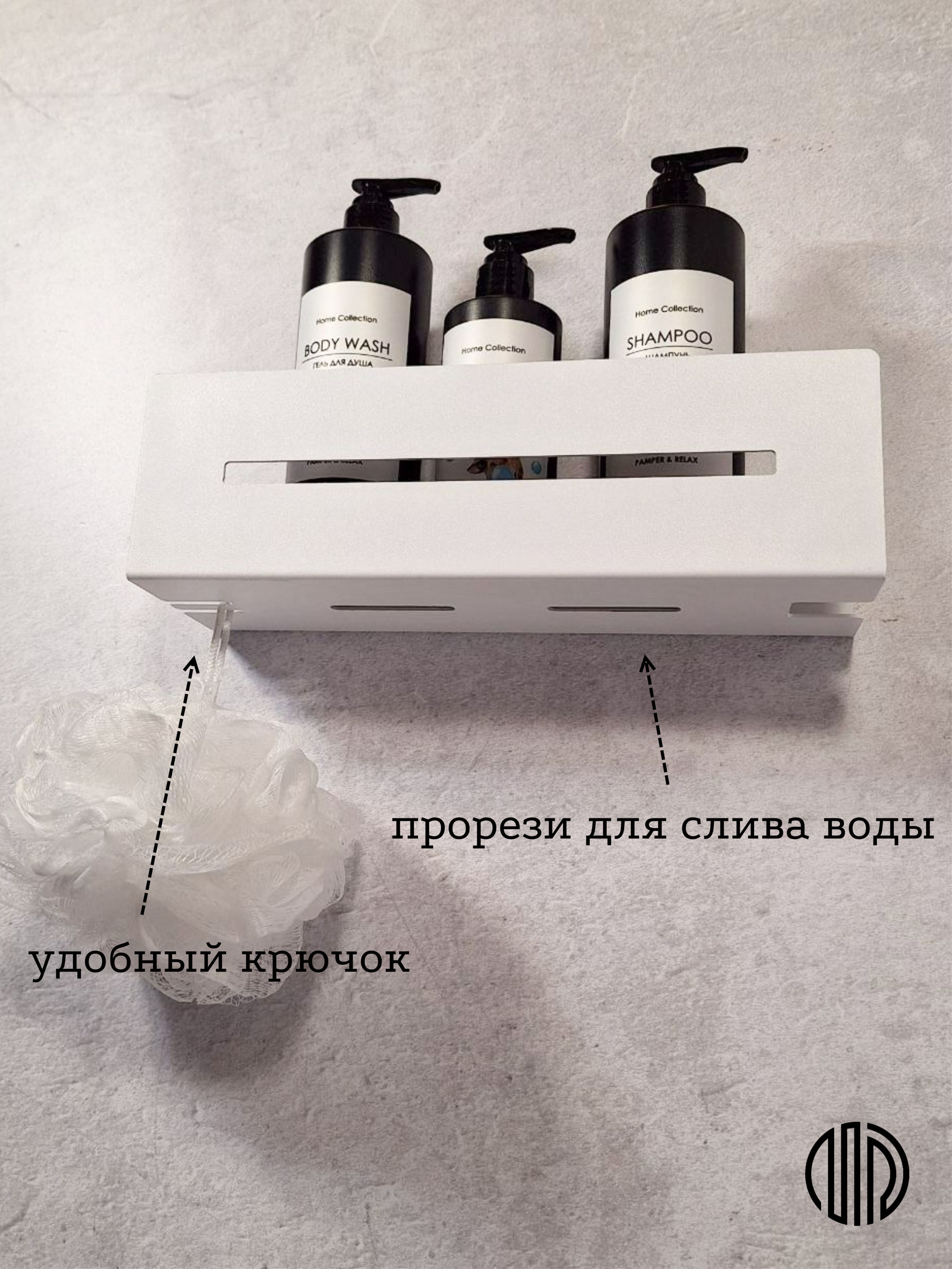 Полка для дома из металла покрыта порошковой краской, данный аксессуар для ванной комнаты стойкий к воде и царапинам. Полка оснащена вырезами для стока воды, а также удобными крючками для мочалки или полотенца . Полочка в ванную комнату придает стильный дизайн интерьеру.