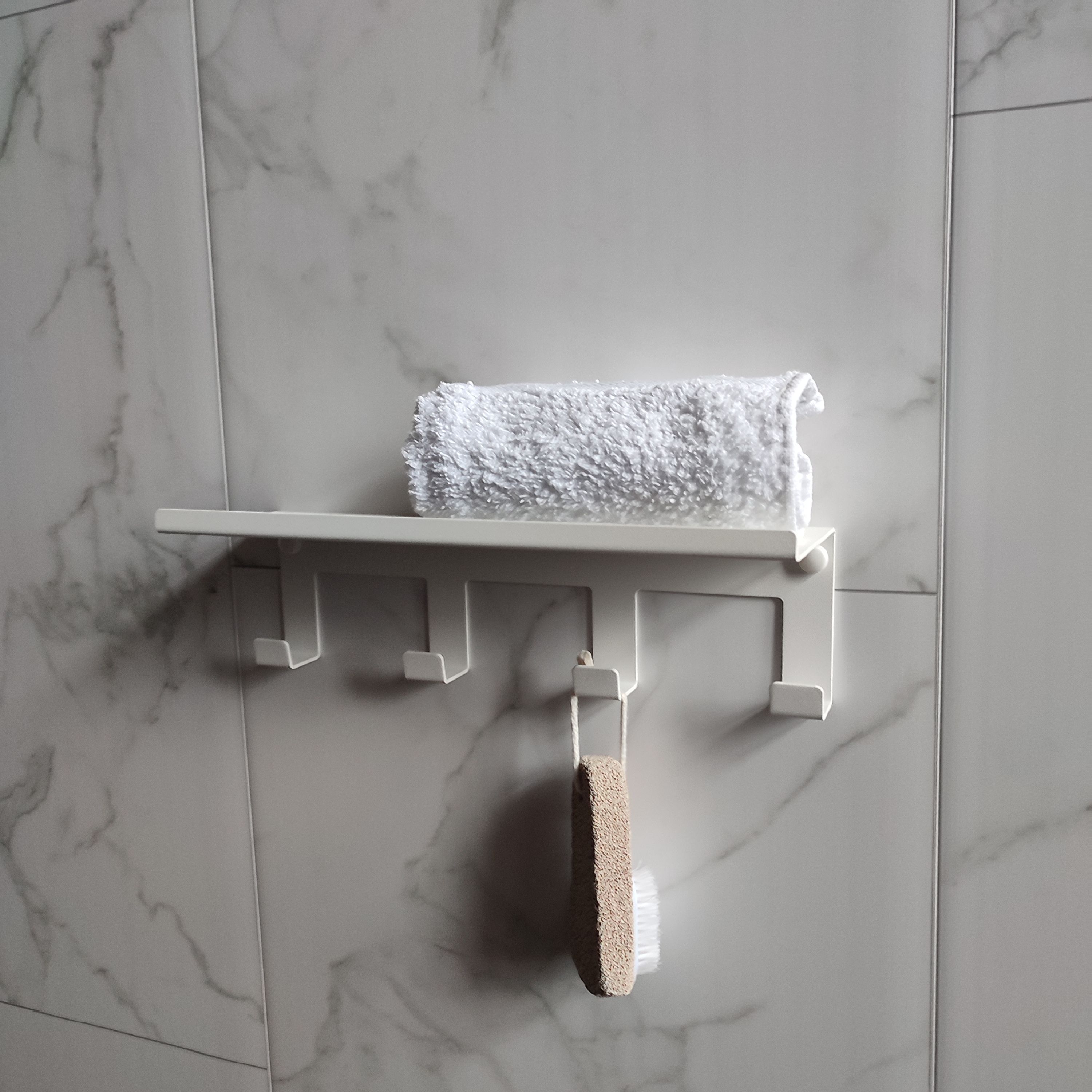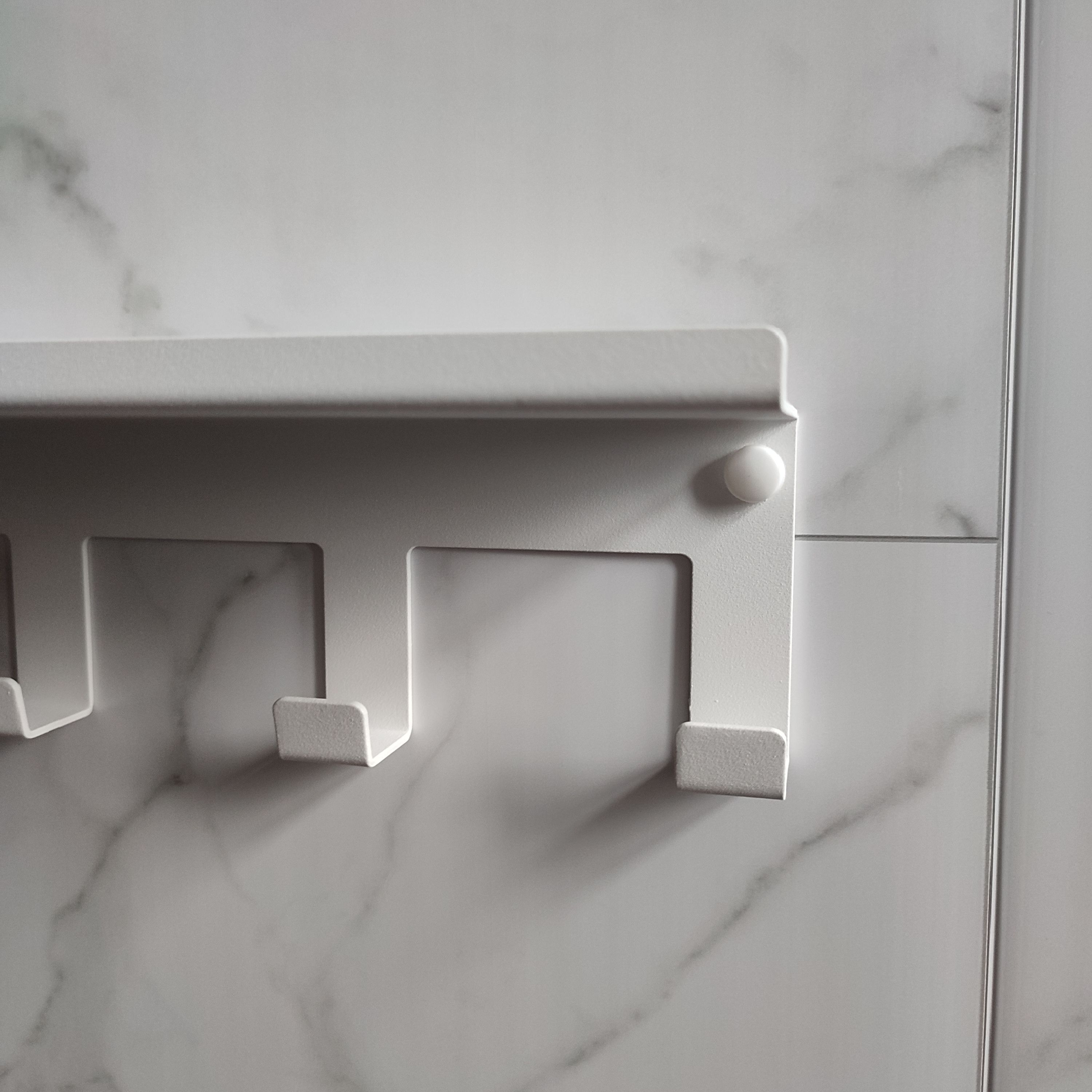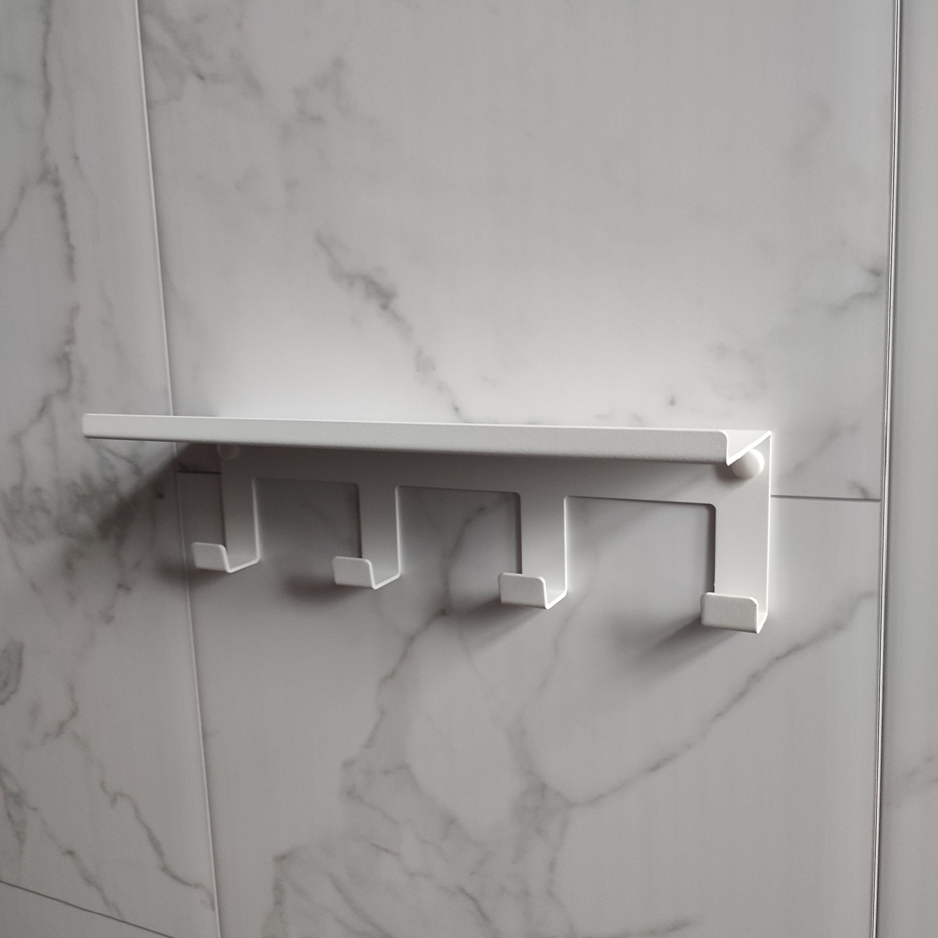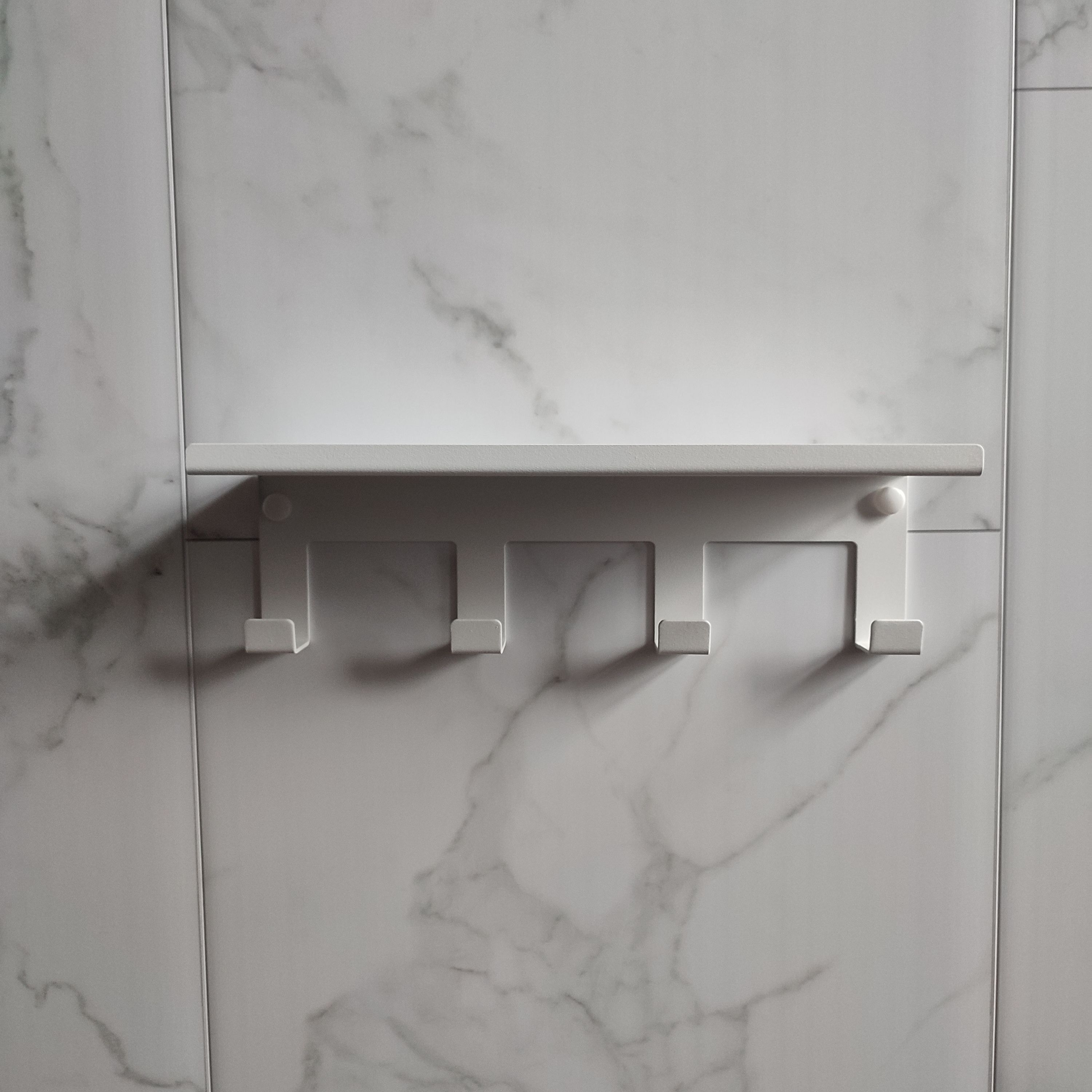 Полка настенная в ванную с крючками - отличный элемент декора для ванной комнаты, является универсальным органайзером для хранения аксессуаров ванны и туалета, оснащена крючками для полотенец и для подвеса халатов. Полочка может использоваться как вешалка в прихожую, ванную или любую другую комнату. Сделана из крепкого металла толщиной 1.5 и выдерживает высокую нагрузку, покрыта матовым антикоррозионным покрытием в цвет белый муар