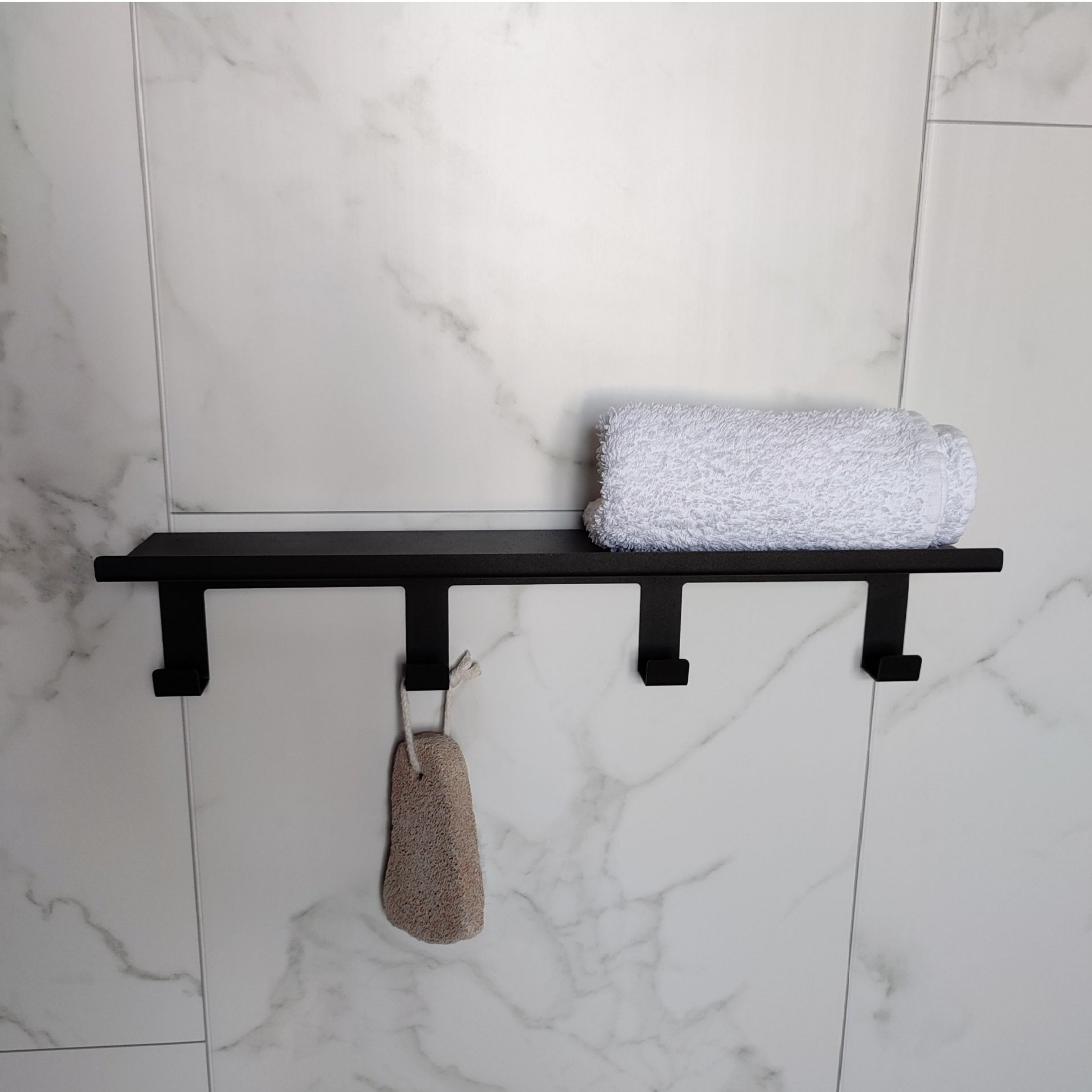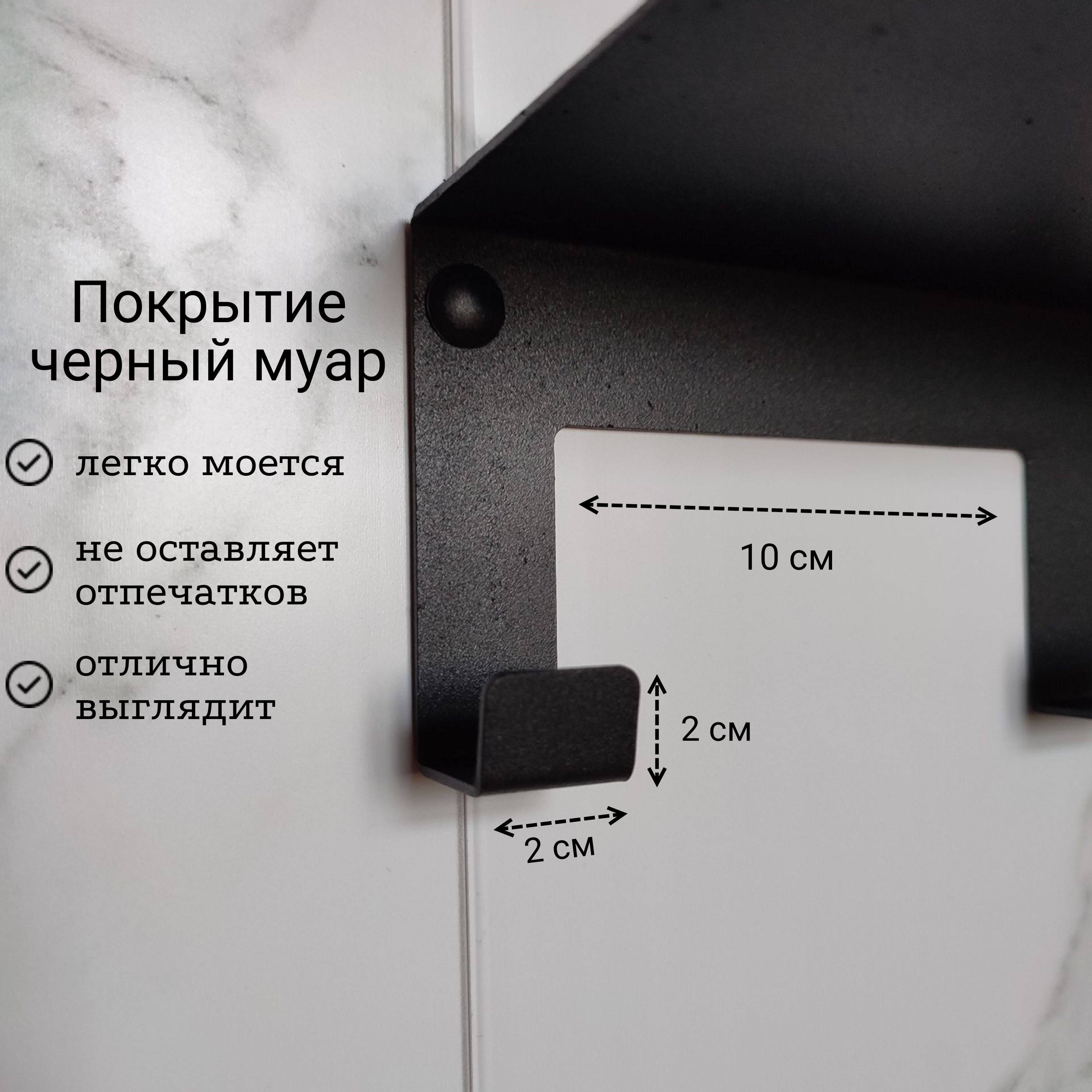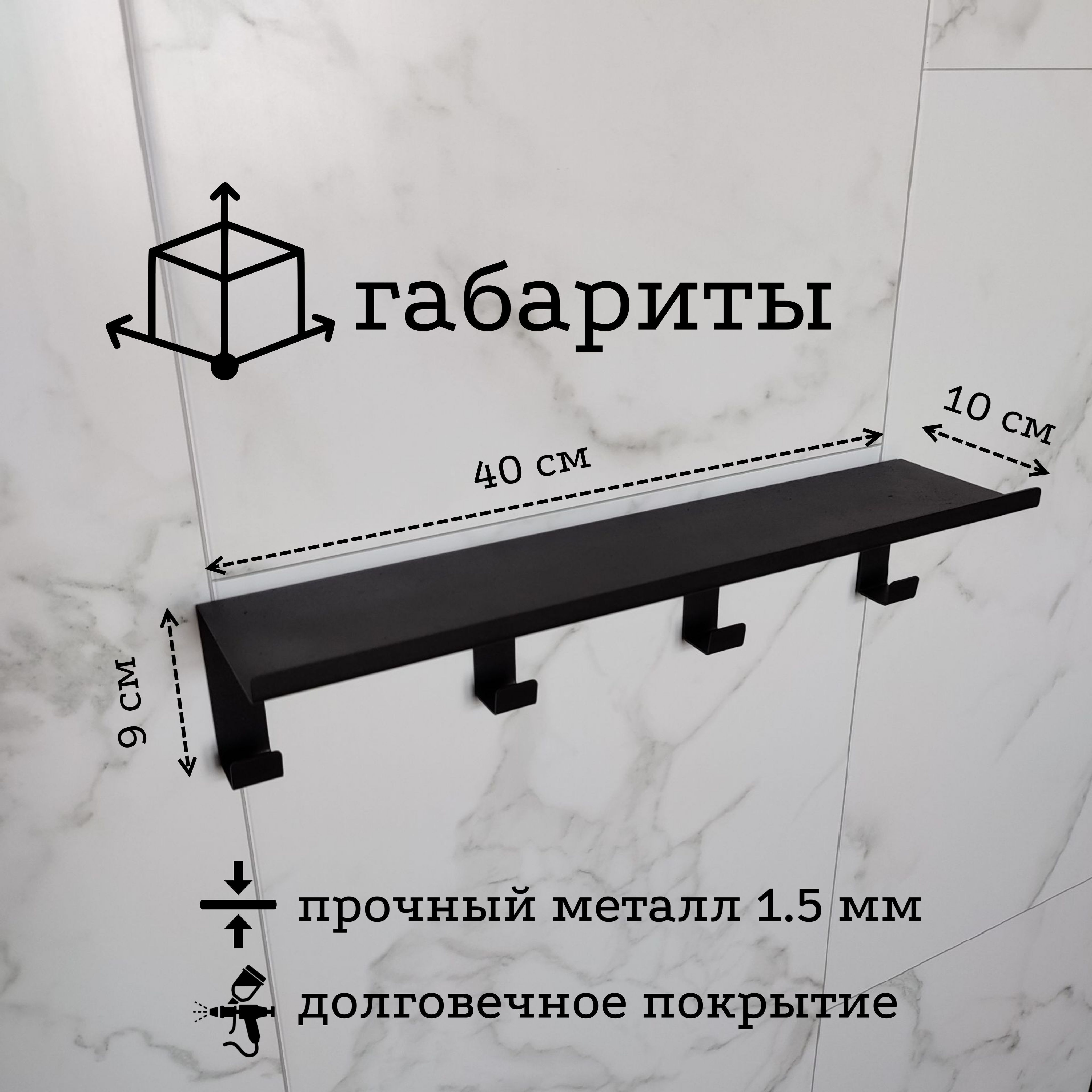 Полка настенная в ванную с крючками - отличный элемент декора для ванной комнаты, является универсальным органайзером для хранения аксессуаров ванны и туалета, оснащена крючками для полотенец и для подвеса халатов. Полочка может использоваться как вешалка в прихожую, ванную или любую другую комнату. Сделана из крепкого металла толщиной 1.5 и выдерживает высокую нагрузку, покрыта матовым антикоррозионным покрытием в цвет черный муар